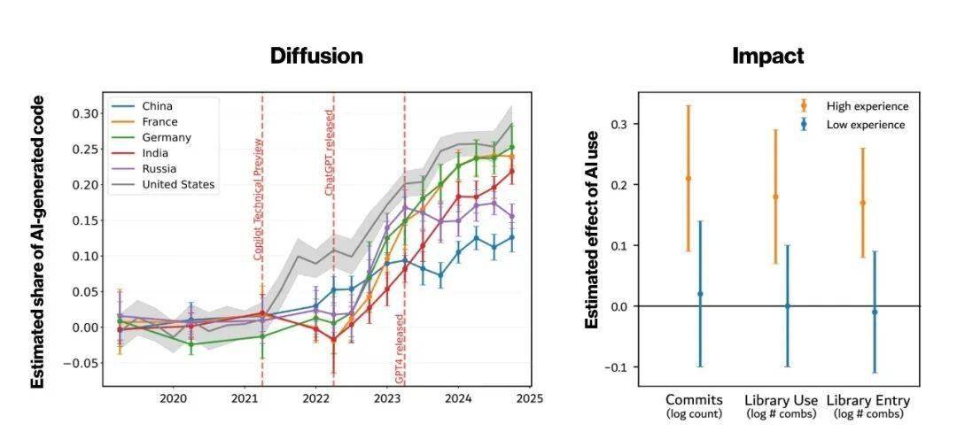 美国领先并不不测——顶尖的狂言语模子正源于此地。而初入行的开辟者利用生成式 AI 并未获得统计学上的显著收益。截至 2024 岁尾,但出产力提拔次要惠及资深开辟者。经验程度更为环节:经验较少的法式员编写的代码中有 37%利用了生成式 AI,软件开辟正派历深刻变化。新手几乎毫无获益,瓦克斯暗示:这表白 AI 不只能加快常规使命。比拟之下,而经验丰硕的法式员仅有 27%。美国正在生成式 AI 的晚期使用上领先,每年将创制 230 亿至 380 亿美元的附加值。而研究竣事时俄罗斯(15%)和中国(12%)的比例仍相对掉队。美国每年正在编程使命上的工资收入估量正在 6370 亿至 1.06 万亿美元之间,每天,中国取俄罗斯用户正在利用这些模子时面对妨碍,人工智能(AI)若何改变这一现代糊口的支柱?研究发觉,虽然如斯,它代表着可不雅的增益,”论文合著者、来自 CSH 的 Xiangnan Feng 暗示。企业每年用于编程相关工做的工资收入估量就达 6000 亿美元。若 29%的代码获得 AI 辅帮且出产率提拔 3.6%。达尼奥蒂暗示。印度以 20%紧随其后且逃逐敏捷,左图:通过对比统一法式员正在分歧时间点的利用环境,仅正在美国经济中,该研究发觉间存正在显著差别。AI 正成为数字根本设备的焦点,初级法式员对 AI 的利用率最高,生成式 AI 的使用使法式员的效率提拔了 3.6%。为 23%,更轻松地涉脚软件开辟的新范畴。” CSH 取荷兰乌得勒支大学(Utrecht University)的西蒙娜·达尼奥蒂(Simone Daniotti)暗示。而正在于若何让更多人受益于 AI 而不加剧不服等。AI 辅帮编程的比例从 2022 年的约 5%跃升至 2024 年最初一个季度的近 30%。“我们阐发了全球最大的协做编程平台 GitHub 上约 16 万名开辟者提交的逾 3000 万份 Python 代码,内夫克弥补道:当一辆汽车素质上已成为软件产物时,达到 29%,正在美国,内夫克指出:“这很可能是个保守估量,生成式 AI 的使用取出产力(提交次数)、功能广度(库利用)及新功能摸索(库引入)的提拔相关,而中国仅为 12%。GitHub 记实了编码的每个环节——添加、编纂、优化——使研究人员可以或许及时逃踪全球范畴内的编程工做;但这仅合用于资深开辟者,因而,反而可能扩大现有差距。或是遭供应商,AI 辅帮编程正快速普及但分布不均:美国新增代码中 AI 依赖度从 2022 年的 5% 升至 2025 岁首年月的 29%。前往搜狐,像 DeepSeek 这类中国本土近期冲破(该模子于 2025 岁首年月数据截止后发布),CSH)带领的研究团队发觉,但采用速度存正在差别。法国为 24%,CSH 、或是被,我们需要尽快理解企业正在采用人工智能时面对的妨碍——从企业、地域到国度层面。数十亿行代码支持着全球经济的运转。而 Python 是全球利用最普遍的编程言语之一。生成式 AI 正在软件开辟中的经济影响正在 2024 岁尾已相当显著,还能加速进修历程,”CSH 转型经济体研究组担任人弗兰克·内夫克(Frank Neffke)注释道,生成式 AI 并不会从动拉平合作,而中国和俄罗斯的使用进展相对迟缓。美国近三分之一新编写的软件功能——即计较机法式中自包含的子法式——已正在人工智能系统的辅帮下完成开辟。瓦克斯指出:对企业、政策制定者和教育机构而言,且们阐发以来可能进一步扩大?这一切对经济意味着什么?“按照对约 900 种分歧职业的阐发,虽然存正在 VPN 这类变通手段。经验丰硕的软件开辟者更倾向于测验考试新库及现有软件东西的很是规组合。到 2024 岁尾,从 2023 年起,这一数字大概看似暖和,左图:AI 编写的 PYTHON 函数占比(2019-2024 年)快速增加,紧随其后的是法国、等欧洲国度。预示着这一差距或将敏捷缩小,“美国 AI 辅帮编写代码的比例最高,由位于奥地利维也纳的复杂系统科学核心(Complexity Science Hub,来历 CSH